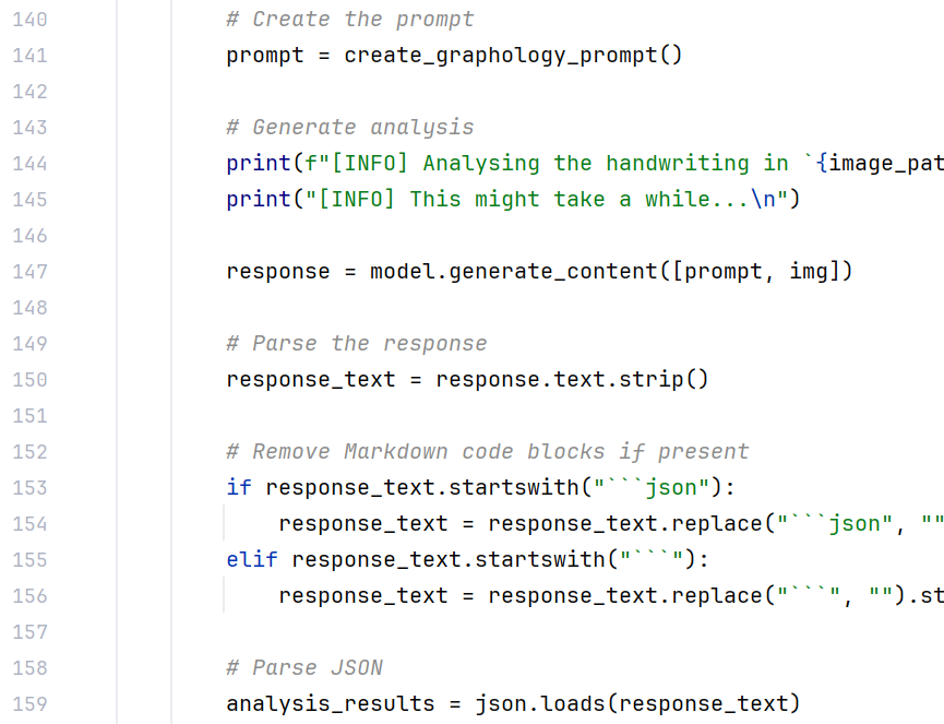 setup_gemini(api_key, model_name="gemini-2.5-flash"): Initialises the Gemini client and returns a GenerativeModel instance.create_graphology_prompt() -> str: Builds and returns the full structured prompt that’s used for instructing Gemini about how to analyse handwriting. This function is the brain of InkSlate. It encodes the graphology rules to follow, the output constraints, and the required JSON schema. This is the function to modify if you need to add or delete any personality fields, change the wording that’s printed in the report, tighten the output constraints, or experiment with different graphology heuristics. This function makes Gemini do the following things:- Evaluate specific handwriting parameters (slant, pressure, spacing, margins, baseline, letter forms, speed).